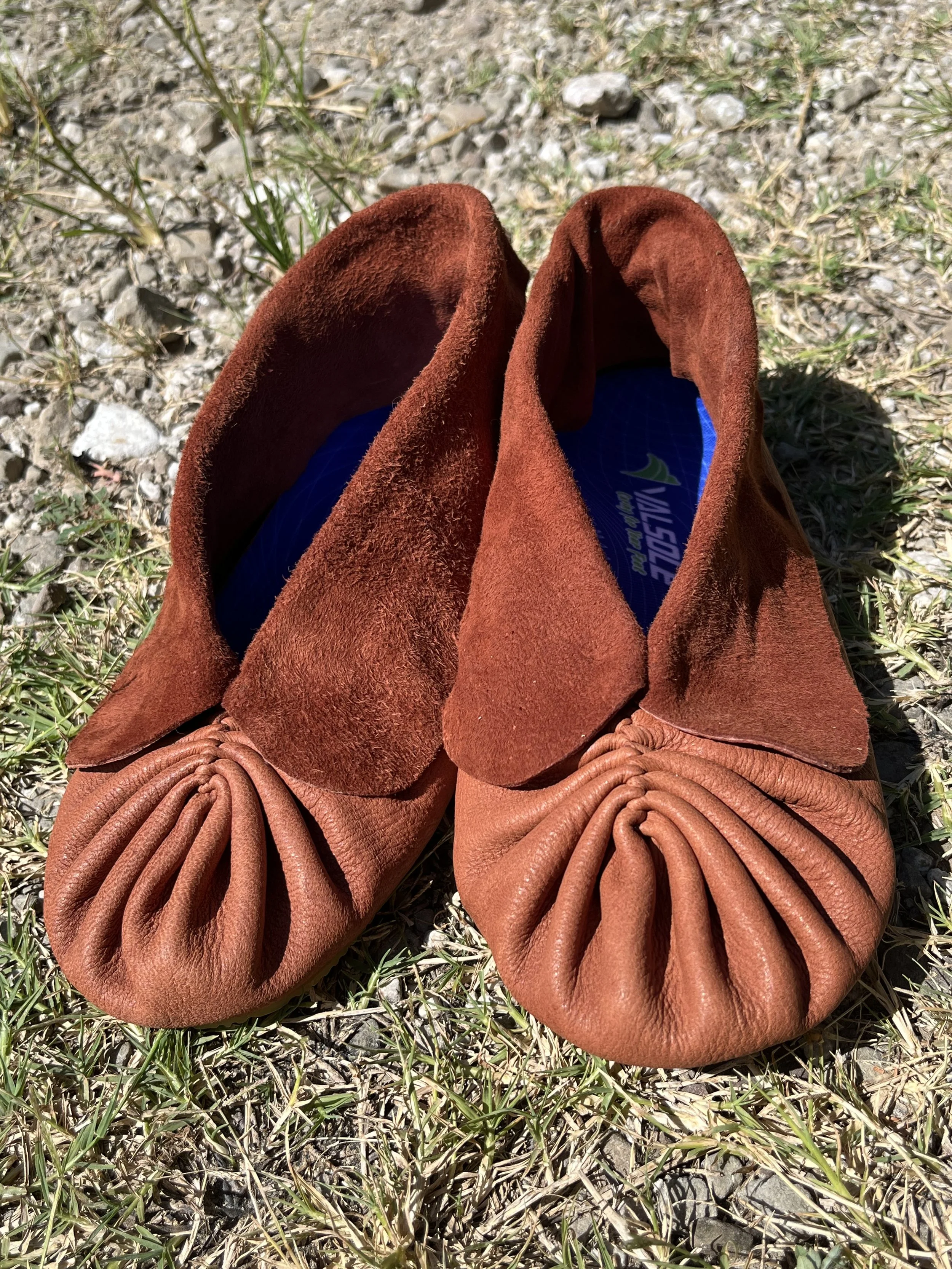 Video of how to pattern & make your own pucker-toe moccasins with supply information.